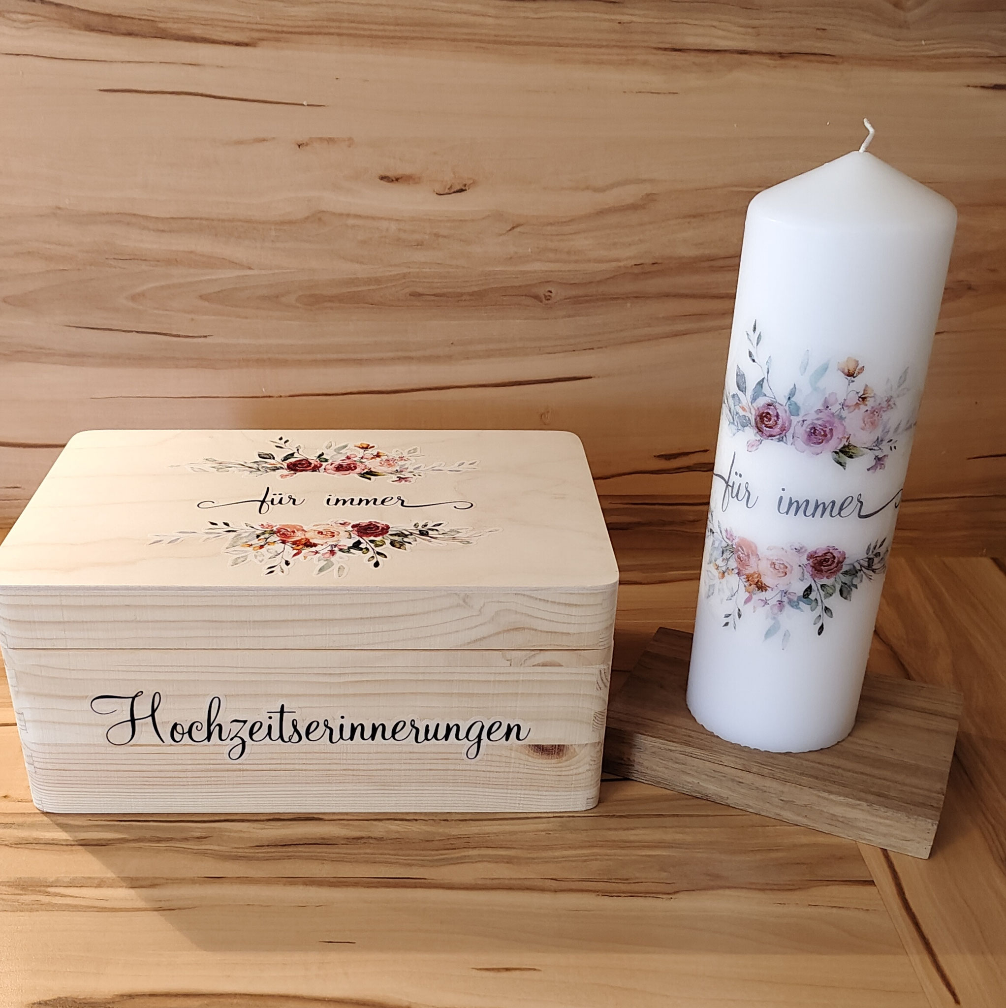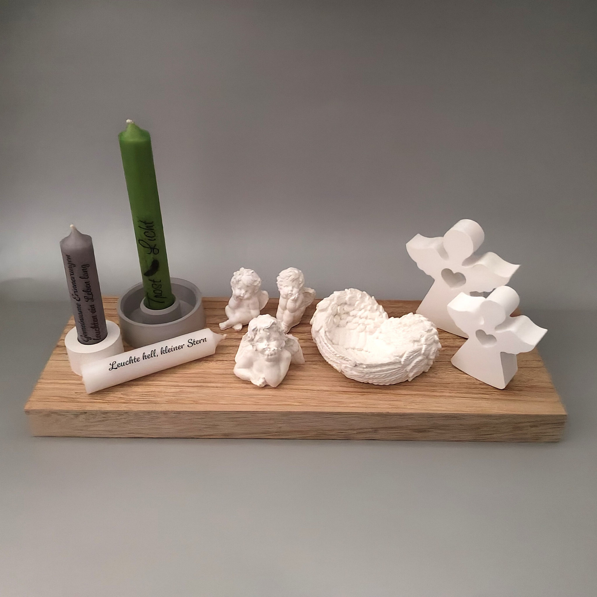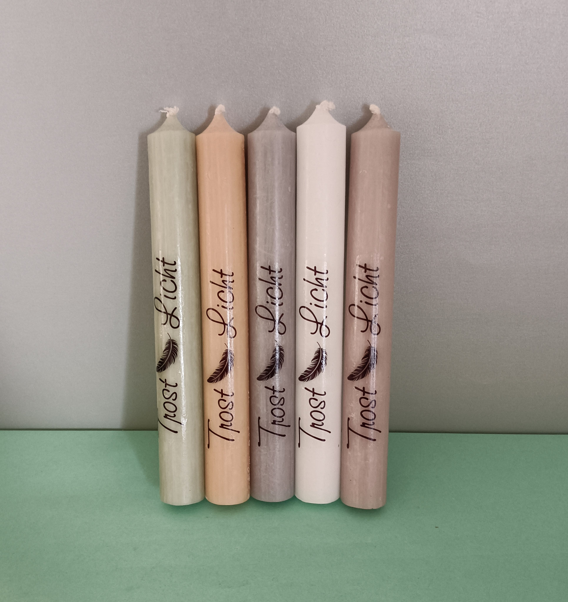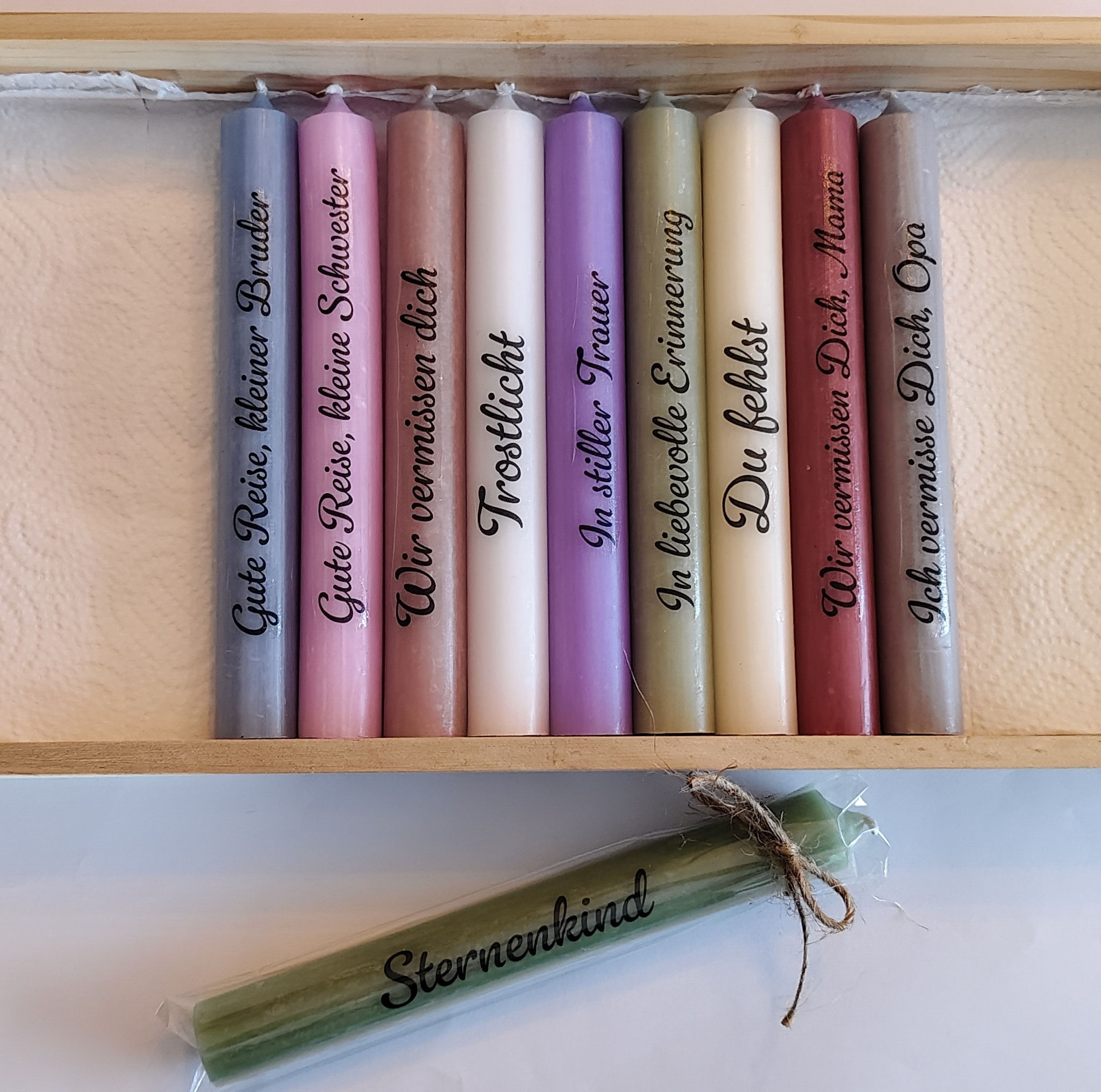 In meinem Sortiment findest du Stab- und Stumpenkerzen für besondere Anlässe wie Geburt, Hochzeit oder Trauerfeiern, sowie Erinnerungskisten, die wertvolle Momente für immer
